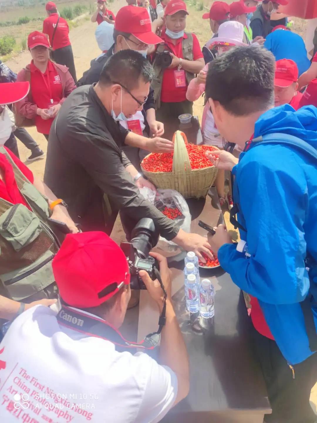 攝影大咖們首先到達位于中寧縣石喇叭村的寧夏紅枸杞種植基地,看到枸杞地里認真采摘枸杞的勞作人,他們拿起相機捕捉鏡頭,記錄枸杞源頭的美好。