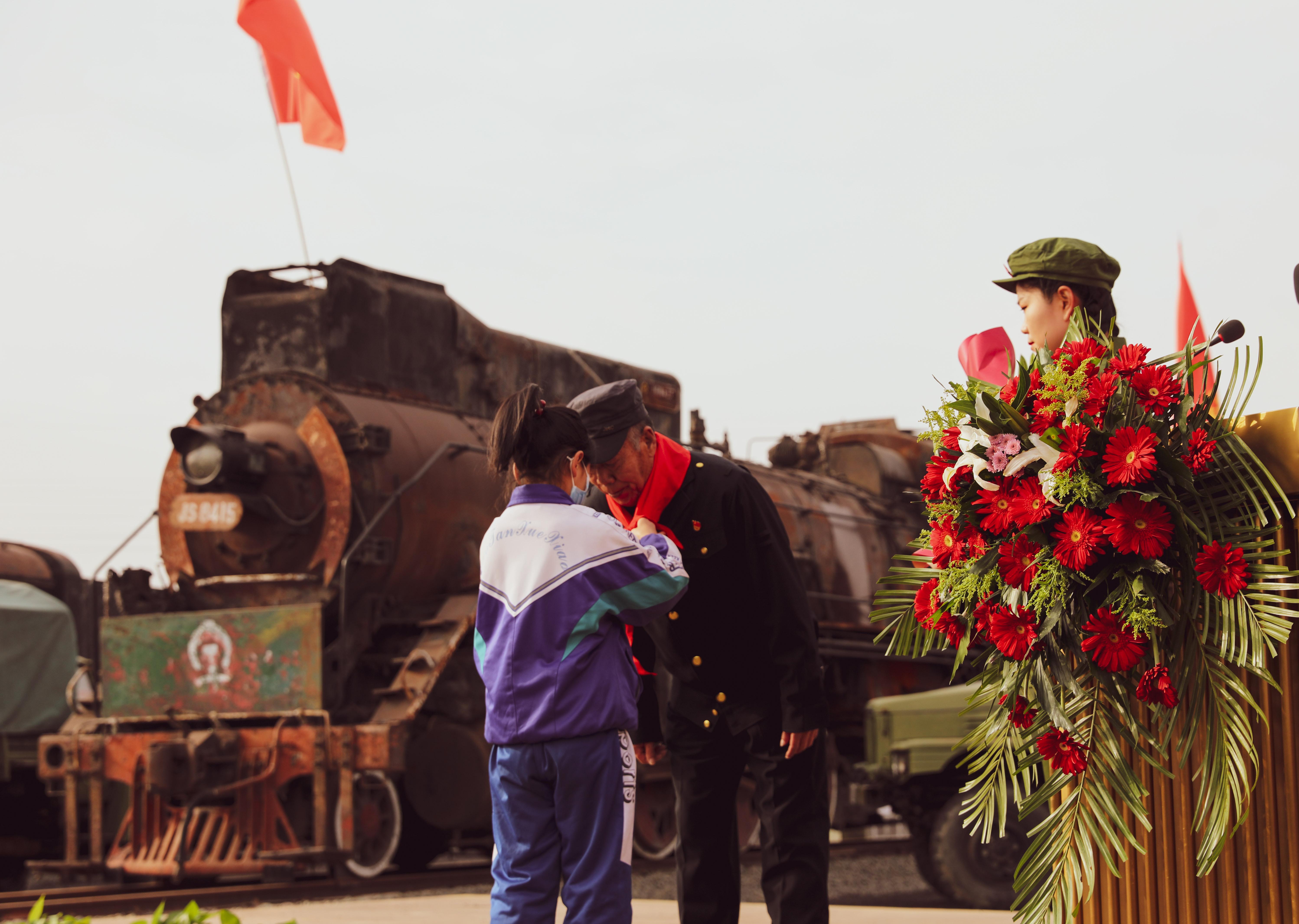 雷鋒號第一任司機(jī)長張鳳武講述了他與雷鋒號的故事,學(xué)生代表為張鳳武佩戴紅領(lǐng)巾并獻(xiàn)上鮮花。